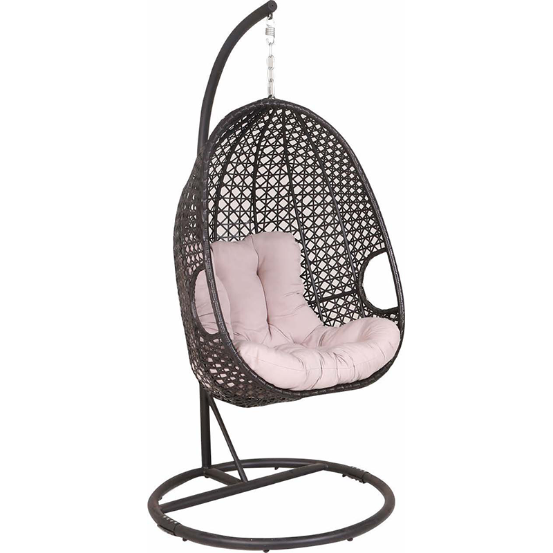 Steel hanging chair with PE rattan and cushion.