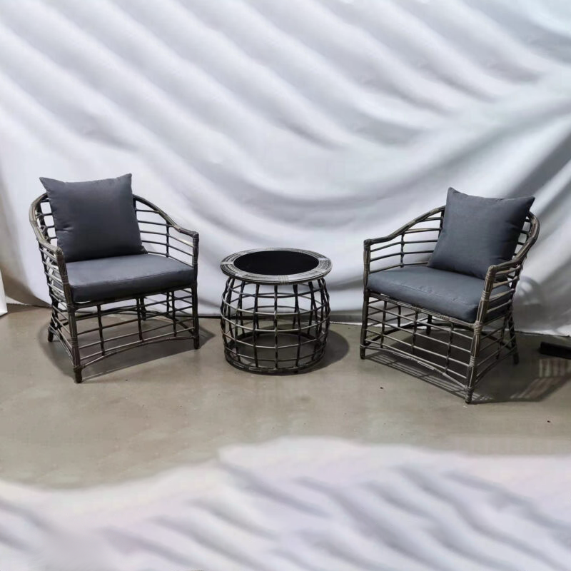 Steel Table with rattan, with water-waved glass; 2pcs Steel Chairs with rattan, with cushion